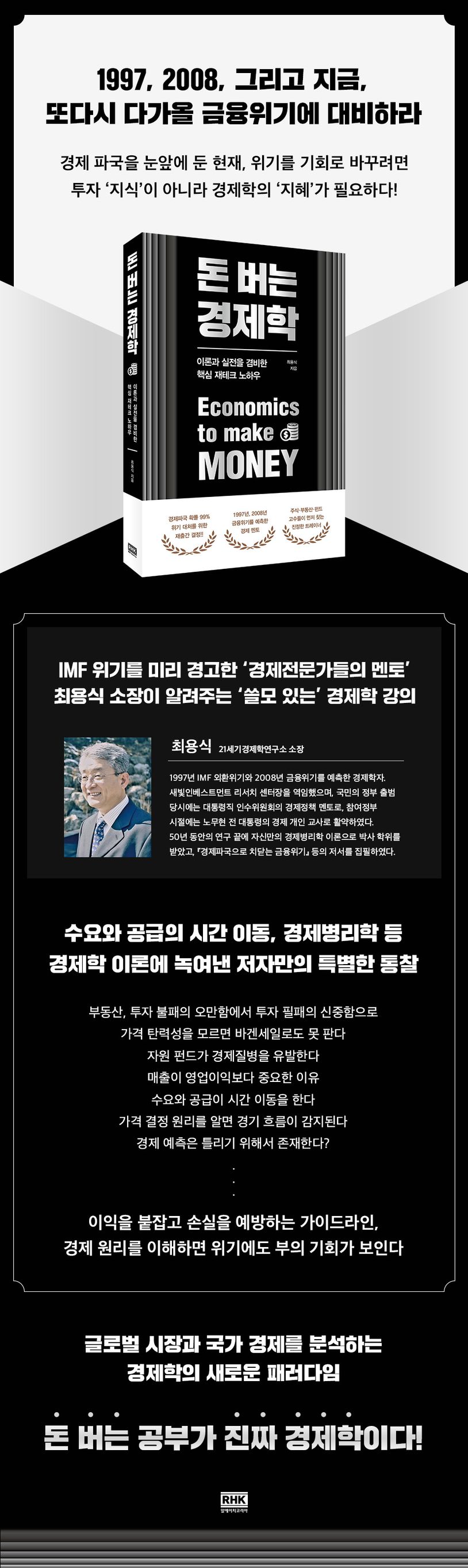 『돈 버는 경제학』은 주식·부동산·펀드 등의 투자 노하우를 경제학의 대표 이론에 적용하여 풀어낸, 이른바 ‘재테크 경제학 독본’이다. 이 책은 여느 재테크 책과는 달리 수요공급 원리, 가격 원리, 환율 법칙, 소득 이론 등의 경제 원리를 재미있는 사례를 들어 다양한 재테크 방법에 적용한다. 수요이동 원리를 통해 부동산 투자 사이클을 알려 주거나, 환율 법칙으로 해외펀드의 허와 실을 제시하거나, 소득 이론으로 경기 흐름의 변곡점을 정확히 찾는 법을 알려 주는 등, 근거 없는 뻥튀기성 투자 정보가 아닌, 경제학에 입각한 돈 버는 지혜를 쉽고 재미있게 소개한다.