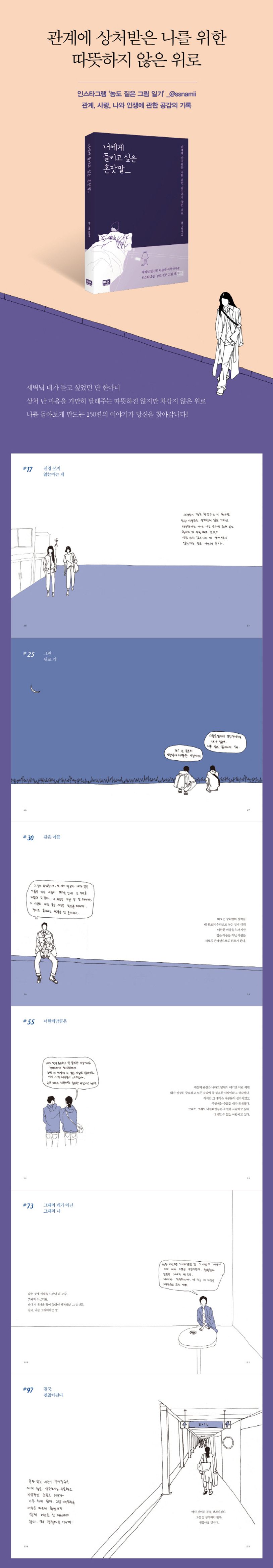 일상에서 우리는 이런저런 일들로 사람들과 관계를 맺는다. 친구, 가족, 연인에 이르기까지 늘 든든한 버팀목이 되어주는 것만은 아니다. 때론 내가 너무 잘 알고 있어서 애써 외면하고 있는 상처를 후벼파는 모진 말을 쏟아내기도 하고, 때론 내 마음을 오해하기도 한다. 여기에 인스타그램 ‘농도 짙은 그림 일기’의 얼굴 없는 주인공은 말한다.