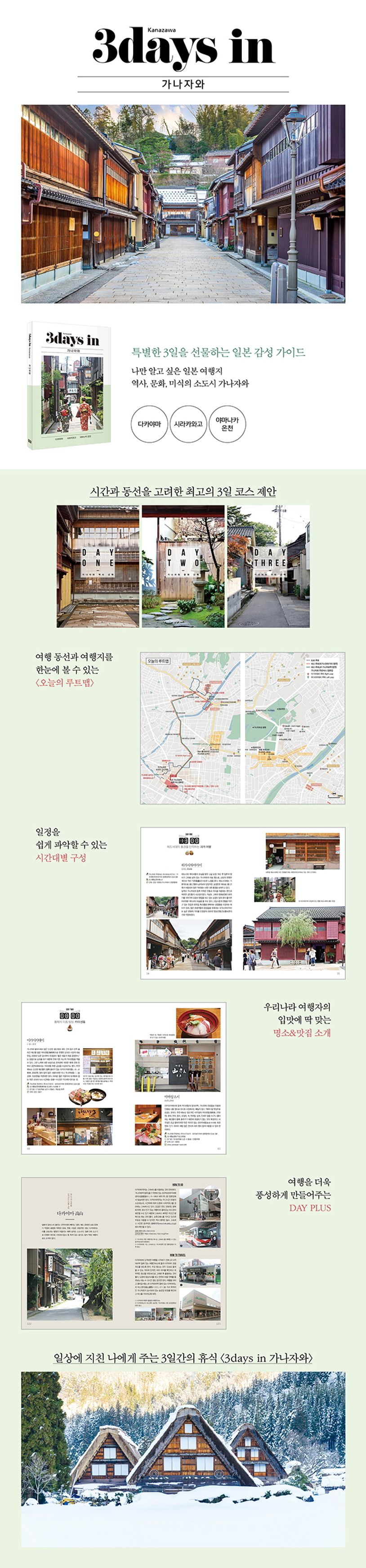 감성 넘치는 여행지, 최신 트렌드를 담은 여행 정보로 도시의 진짜 매력을 있는 그대로 알려주는 [3데이즈] 일본 시리즈. 여행지의 아름다움을 더욱 깊이 있게 전달하고, 완벽한 여행 코스를 제안하여, 현지인처럼 편안하게 그 도시의 참모습을 즐길 수 있도록 도와준다. 앞서 출간한 도쿄, 오사카, 후쿠오카 등 대도시에 이어, 이번에 가나자와부터 새로 선보이는 일본 소도시 여행 시리즈와 함께라면 색다른 여행의 맛을 느낄 수 있을 것이다.