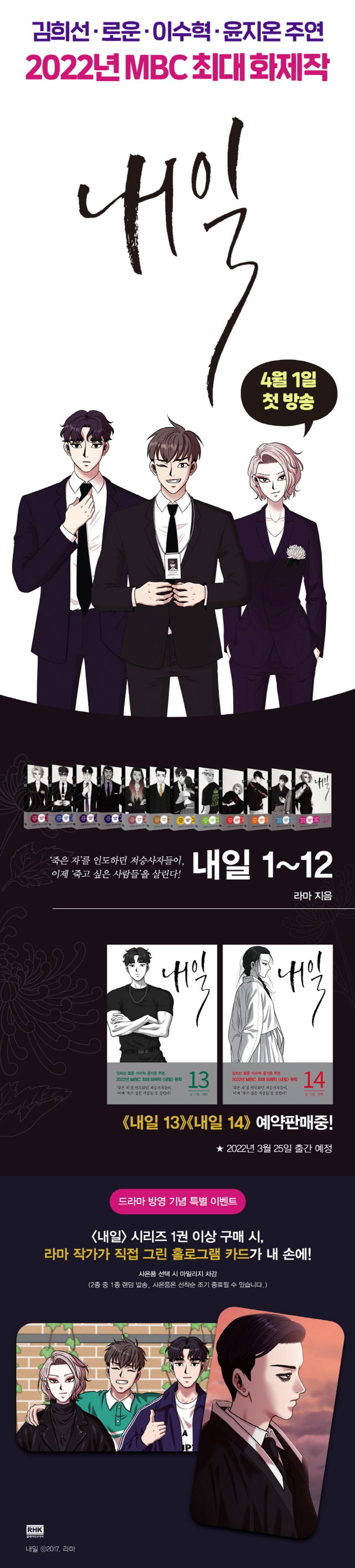 스스로 자기 인생을 끝내려는 자들을 찾아다니며 그들의 사연을 들어주고, 위로해주고, 그들이 다시 살아갈 수 있도록 돕는 저승사자들의 이야기를 다룬 『내일』 제1권. ‘죽은 자들을 인도하는 저승사자들이 사람 살리는 일을 한다’는 독특한 설정으로 네이버 연재 초반부터 독자들의 눈길을 끈 이 작품은 회차가 거듭될수록 예상치 못한 전개가 이어지고, 캐릭터의 매력과 묵직한 위로가 더해지면서 재미와 감동을 동시에 잡았다는 평가를 받고 있다.