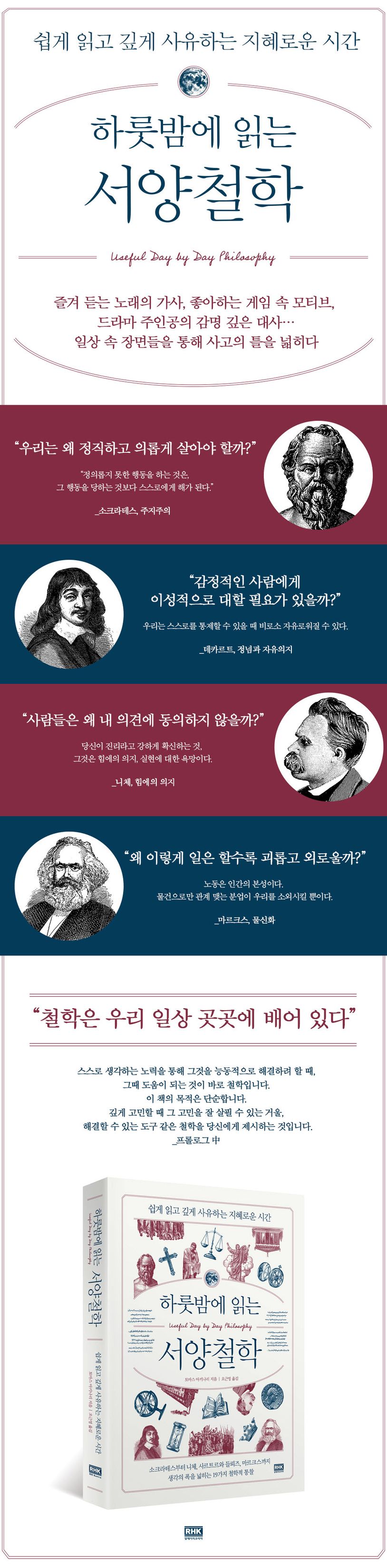 방향을 잃거나 길을 잊어버리는, 불빛 하나 보이지 않는 어두운 밤 같은 순간이 우리에겐 뜻하지 않게 자주 찾아온다. 틀림없다고 생각했던 사실이 여지없이 틀렸을 때, 갑자기 끓어오르는 감정을 제어하기 힘들 때, 진짜 내 모습이 어떤 건지 헷갈릴 때, 어떤 일을 해도 행복하지 않을 때, 우리에게는 철학이 필요하다. 《하룻밤에 읽는 서양철학》은 시대를 수놓았던 수많은 철학가들과 문장들을 소개하며 우리가 일상에서 마주하는 고민들은 모두 철학을 껴안고 있다고 설명한다. 잠들어 있는 내면을 깨우고 삶의 부족한 점을 채우며, 이 책은 하루 종일 쌓아온 고민을 고스란히 비춰볼 시간을 우리에게 선사한다.
