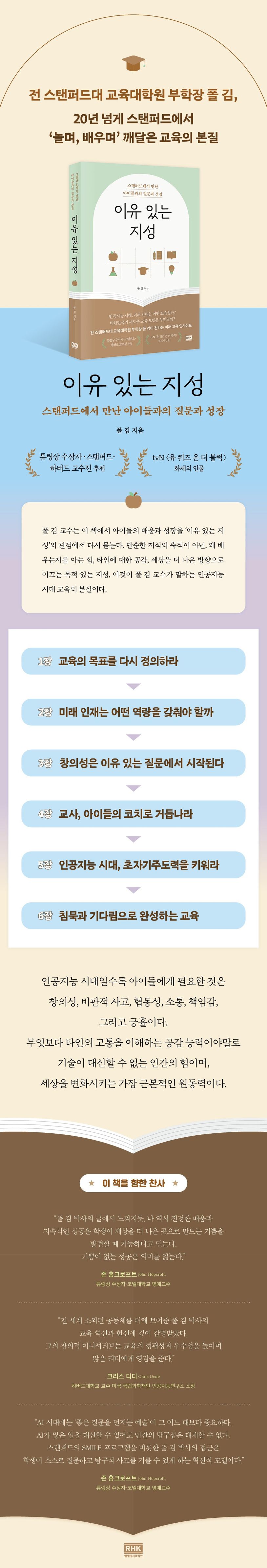 『이유 있는 지성』은 폴 김 교수가 정리한 미래인재의 핵심 역량인 6C(창의성, 비판적 사고, 협동성, 소통, 책임감, 긍휼)를 중심으로 질문 중심 학습, 교사의 코칭 역할, 초자기주도성, 기다림의 교육 등 새로운 교육의 방향을 제시한다. 또한 스탠퍼드를 비롯해 인도, 에티오피아, 카자흐스탄 등 세계 여러 나라의 아이들과의 만남을 통해 얻은 생생한 사례들이 교육의 가능성을 실감나게 보여준다. 아이의 미래를 걱정하는 학부모, 교육의 본질을 다시 묻는 교사, 그리고 아이들의 가능성을 믿는 모든 이들에게, 이 책은 함께 걸어갈 새로운 배움의 길을 제안한다.