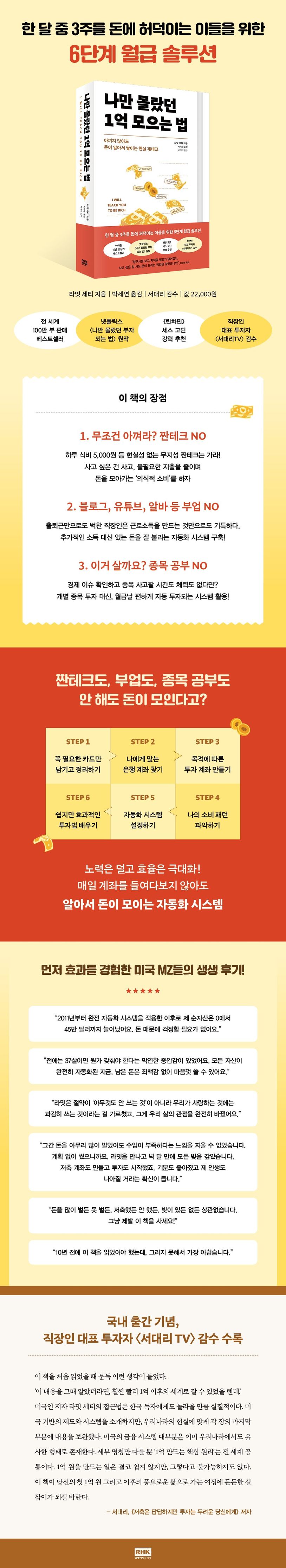 짠테크가 기본인 재테크 도서들에 일침을 가하며 미국 MZ들의 전폭적인 공감을 받아 전 세계 100만 부 판매를 기록한 《나만 몰랐던 1억 모으는 법》이 국내에 출간된다. ‘극단적인 절약 중심의 재테크 방법보다 중요한 건, 자동으로 굴러가는 돈 관리 시스템을 구축하는 것’이라고 말하며 ‘사고 싶은 것을 원하는 만큼 사면서도 충분히 부자가 될 수 있다’는 내용을 담은 이 책은 미국에서 출간 즉시 뉴욕타임스 베스트셀러에 올랐으며, 출간 이후 15년 연속 아마존 베스트셀러를 차지하며 미국 내에서 ‘사회초년생들의 재테크 바이블’로 불리고 있다.