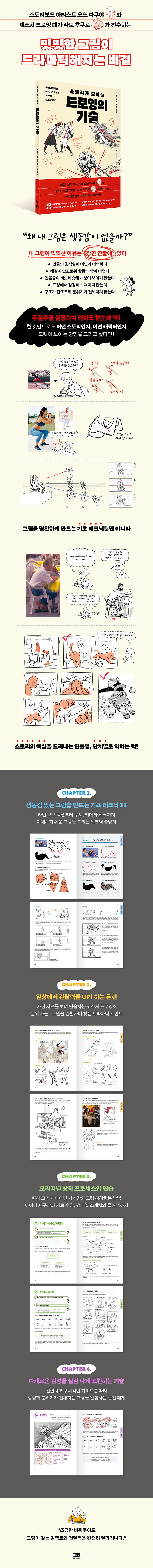 두 저자는 ‘스토리가 보이는 그림’을 위해 무엇보다 그림 속 오브제가 명확해야 한다고 강조한다. 이를 위해 독자는 라인 오브 액션, 제스처, 셰이프, 체인지와 푸시, 카메라 워크 등 13가지 핵심 기법을 훈련하게 된다. 나아가 실제 사물과 인물을 관찰하며 드로잉하는 방법, 스토리를 드러내는 핵심 포인트, 실전 예제 등을 통해 표현력을 확장할 수 있다. 또한 아이디어 발상과 자료 수집 같은 실질적인 팁도 담겨 있어, 자신만의 오리지널 작품을 창작하는 데 든든한 길잡이가 되어 준다.