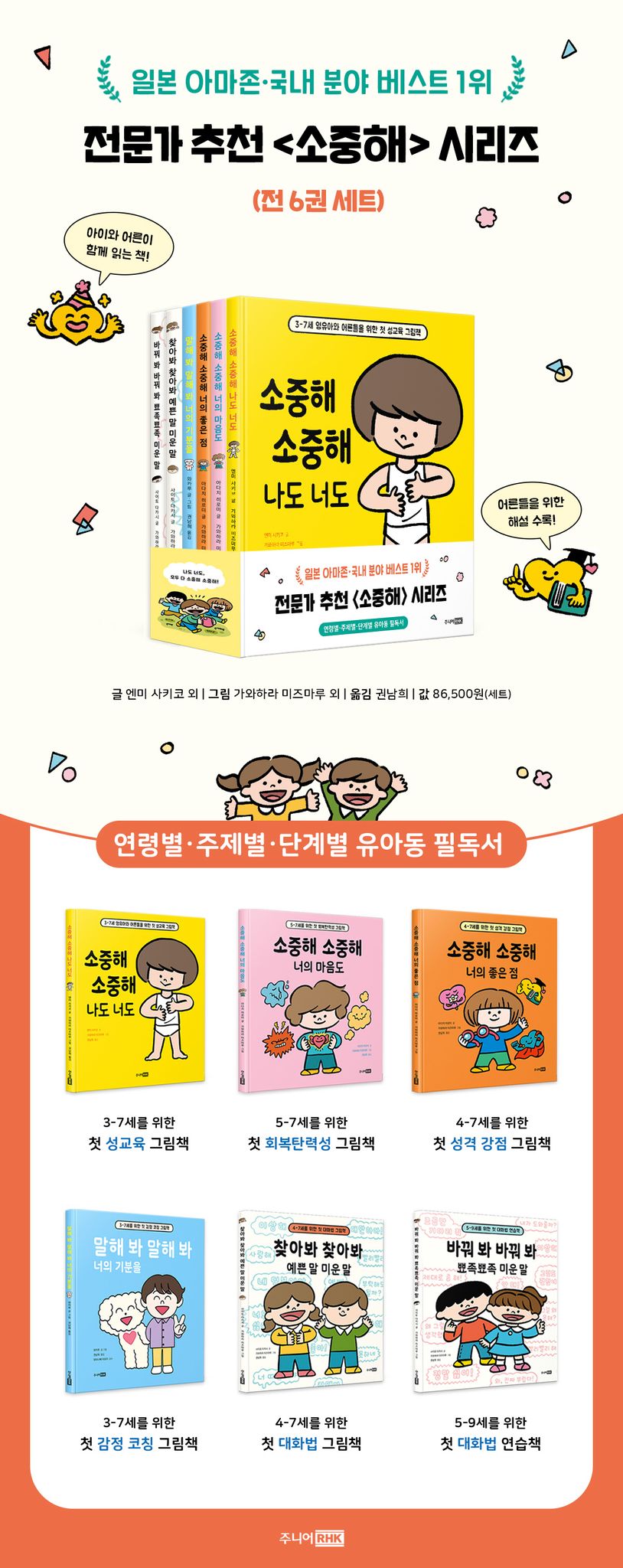 3~9세 아이들의 발달 단계와 삶의 중요한 주제에 맞춰 기획된 〈소중해〉 시리즈는 출간 직후 일본 아마존과 국내 분야 1위를 기록하며 꾸준히 사랑받고 있다. 단순한 정보 전달을 넘어 아이들이 자신의 몸과 마음을 사랑하고, 다양한 감정을 건강하게 다루며, 타인과 따뜻한 관계를 맺도록 돕는 ‘영유아 필독서’로 자리 잡았다.