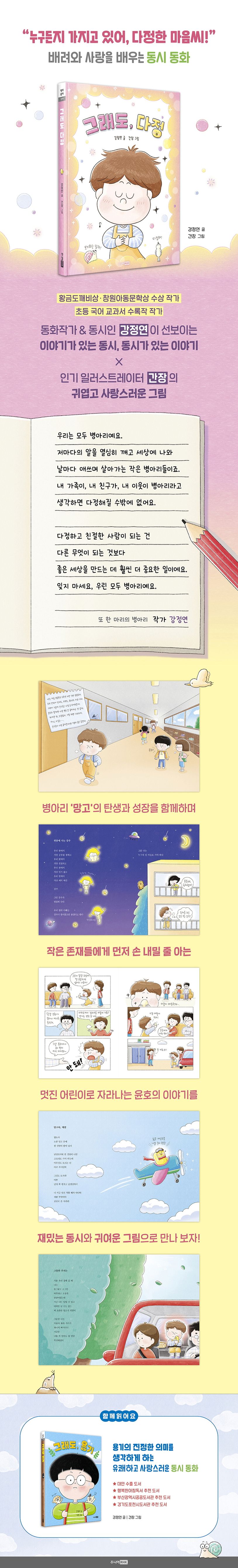 《그래도, 다정》은 작은 생명의 탄생과 성장을 함께하며 먼저 손 내밀 줄 아는, 다정한 어린이로 자라나는 한 아이의 성장기를 그린 ‘동시 동화’다. 지난 2024년 5월, 동시 동화 《그래도, 용기》를 통해 매력적인 장르를 선보였던 강정연 작가는 이번 신간에서도 동시와 이야기를 맛깔나게 버무려 내어 독자들의 시선과 흥미를 이끈다.