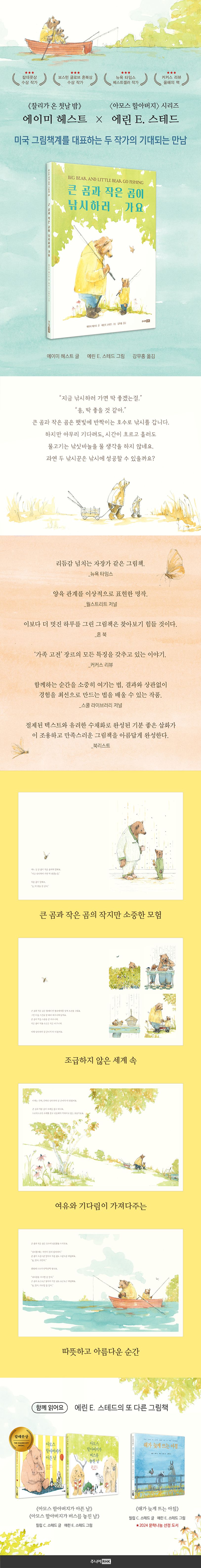 《큰 곰과 작은 곰이 낚시하러 가요》는 햇빛에 반짝이는 호숫가로 낚시를 하러 떠나는 큰 곰과 작은 곰의 조용하면서도 평화로운 하루를 담은 이야기로, 미국을 대표하는 그림책 작가인 에이미 헤스트와 에린 E. 스테드가 함께 작업했다. 수십 년간 수많은 그림책과 어린이책을 써 온 글 작가 에이미 헤스트는 크리스토퍼 상(총 3회), 보스턴 글로브 혼북상 등 유수의 문학상을 수상하며 작품성을 인정받았으며, 이번 신작에서는 차분하고 침착한 문장으로 큰 곰과 작은 곰의 작지만 서정적인 모험을 아름답게 그려냈다. 그림책 문법에 충실한 이야기 구성은 이제 막 책 읽기에 관심과 흥미를 갖기 시작한 어린이 독자들은 물론, 그림책을 애독하는 성인 독자들도 충분히 만족시켜 줄 것이다. 《아모스 할아버지가 아픈 날》로 칼데콧상을 수상한 에린 E. 스테드는 특유의 섬세하고 따뜻한 그림으로 독자들의 시선을 붙든다. 큰 곰과 작은 곰 뒤로 펼쳐지는 목가적이고 평온한 풍경은 작품의 메시지를 더욱더 풍성하게 만든다.