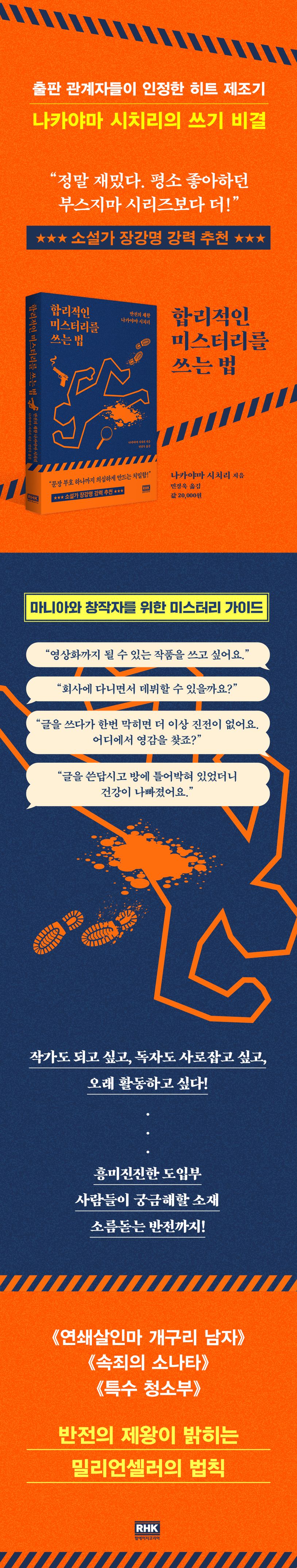독자를 놀라게 하는 반전으로 정평이 난 나카야마 시치리가 평생을 바쳐 애정해온 미스터리에 대한 생각과 작품을 대하는 방식에 대해 밝힌다. 65세를 앞둔 그는 데뷔 16년 차 작가로, 현재 일본 출판계에서 가장 부지런히 작품을 발표하고 있다. 77번째 작품 출간을 앞둔 그는 지금까지 대표적인 문학상 수상을 비롯해 작품의 영상화, 베스트셀러까지 누구나 꿈꾸는 결과물을 이뤄냈다. 사실 그는 ‘이 미스터리가 대단해!’로 데뷔하기 전에는 평범한 회사원이었다. 하루아침에 소설가라는 꿈을 이룬 것이 아니라, 낙선의 고배를 마시며 어떻게 공모전에 뽑힐 수 있을지 주위의 작은 충고도 허투루 듣지 않았고 심사 위원의 피드백에 맞는 작품을 쓰고자 했다. 데뷔 후 몰려든 제안을 가리지 않고 출판사마다 제시한 요청에 성실히 응한 결과 지금의 ‘나카야마 시치리 월드’가 탄생한 것이다. 아홉 가지 옵션 중 하나를 선택하면 되는데 모든 조건을 채워 넣은 작품을 쓴 에피소드부터 매일 적은 수면시간과 영양 섭취에도 체력을 유지하며 마감을 반드시 지키는 작가가 되기까지 생생한 기록이 이 책에 담겨 있다. 지극히 합리적인 비법이 있다고 소개했으나, 정작 내용을 살펴보면 누구보다 진실하게 이 업에 임하고 있음을 알 수 있어 일에 대한 태도를 배울 수 있다는 점에서도 흥미롭다.