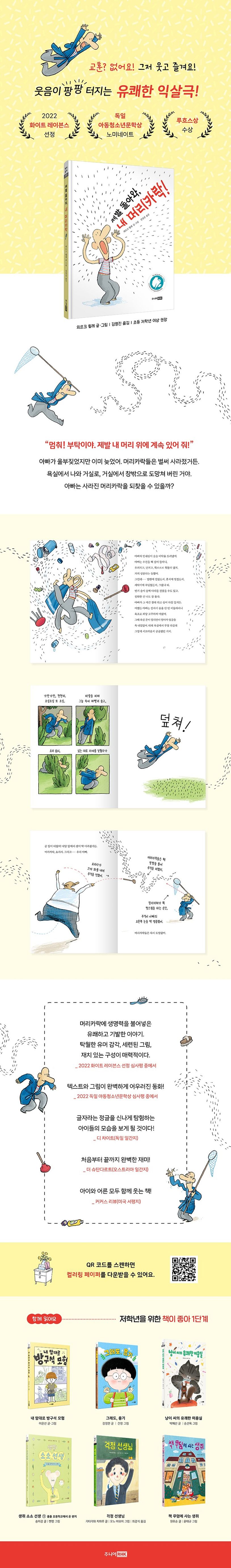 《제발 돌아와, 내 머리카락!》은 아빠 머리에서 탈출한 머리카락과 이를 뒤쫓는 아빠의 유쾌한 소동을 그린 동화이다. 머리카락을 되찾기 위한 아빠의 고군분투는 슬랩스틱 코미디처럼 익살스럽게 펼쳐지며 웃음을 자아낸다. 식당, 빵집, 동물원 등 다양한 곳에서 벌어지는 머리카락 추격전은 빠른 전개와 기발한 상상력으로 시선을 붙잡는다. 쫓고 쫓기는 내용이 반복되지만, 만화적인 연출과 역동적인 화면 구성으로 전혀 지루하지 않다. 특히 과장된 표정과 몸짓으로 절박함을 표현하는 아빠의 모습에서는 비극을 코믹으로 풀어 가는 작가의 노련함을 엿볼 수 있다.