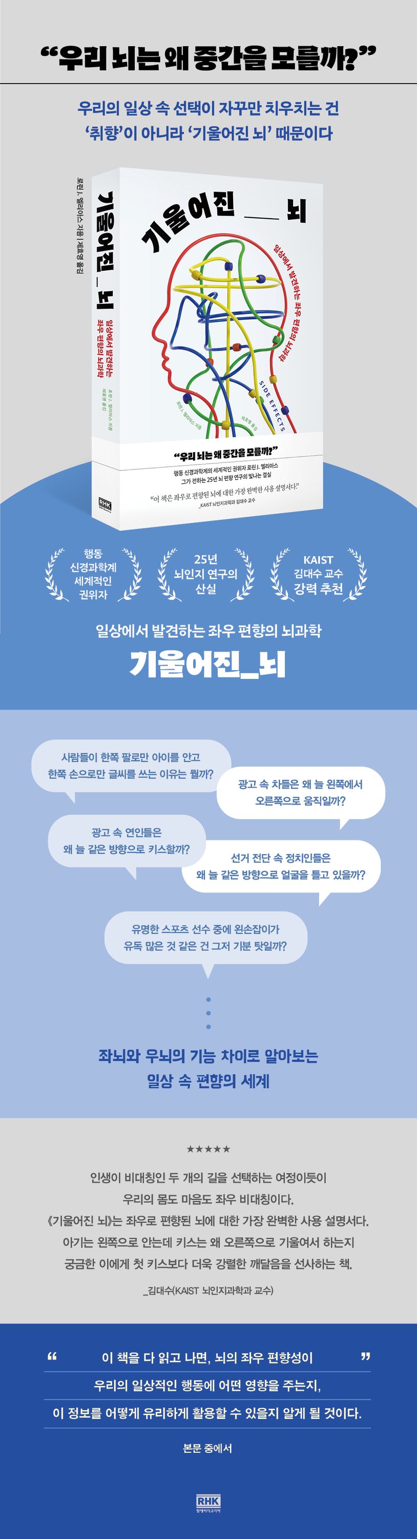 이 책은 일상에 좌우 편향이라는 돋보기를 드리워 익숙한 풍경을 뇌과학적 시선으로 새롭게 바라보게 한다. 이를테면 양쪽 뇌의 차이를 주제로 우리의 ‘기울어진 삶’을 읽게 해주는 해설서다.