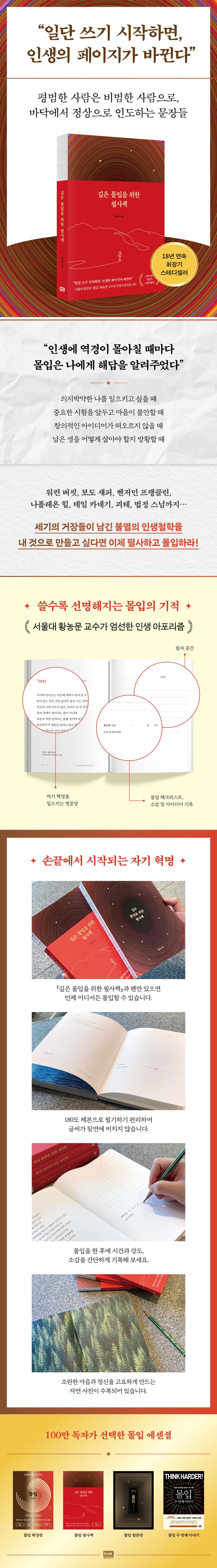‘몰입’은 단순히 책을 읽고 이론을 이해하는 것에서 그치는 게 아니라, 실천을 통해 점진적으로 익혀야 하는 행위다. 하지만 일분일초까지도 시선을 사로잡는 릴스와 숏츠, 핸드폰 분리불안증, 생활 소음들로 인해 몰입을 어려워하는 이들이 많다. 황농문 교수는 어떻게 하면 좀 더 쉽게, 몰입할 수 있을지 방안을 고민했고, 그 결과가 바로 『깊은 몰입을 위한 필사책』이다. 내용을 곱씹으며 필사하는 행위는 뇌의 수많은 시냅스를 활성화시켜 몰입을 유도하기 때문이다. 또한 이 책의 수록된 문장은 저자가 엄선한 인생 아포리즘으로, 머릿속을 명료하게 정리해주는 동시에 생각의 방향을 안내하는 강력한 나침반이 되어준다. 집중이 어려워진 시대, 우리에겐 깊은 몰입이 필요하다. 이제 핸드폰 대신 펜을 들어보자.