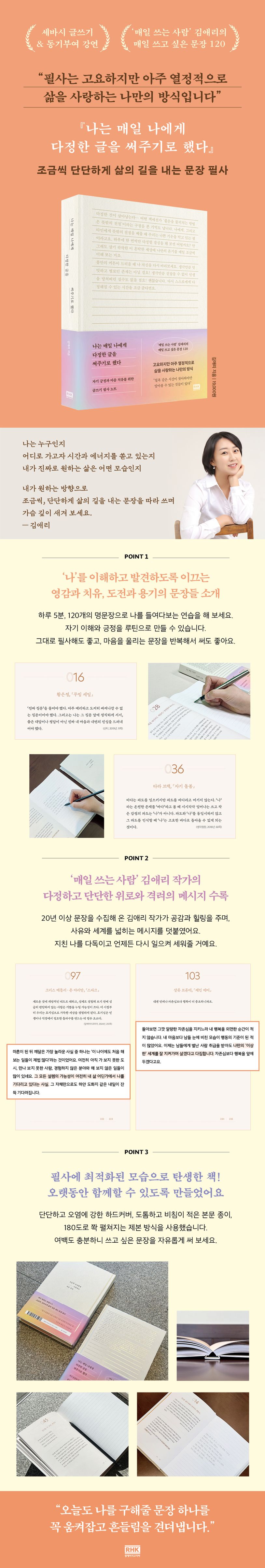 이 책은 20년 넘는 시간 동안 좋은 책의 문장을 필사해 온 김애리 작가가 길어 올린 120개의 문장들을 담고 있습니다. 그리고 그 문장들을 읽고 쓰며 영감과 치유와 도전과 용기를 얻고, 새로운 눈으로 삶을 바라보게 된 김애리 작가의 다정한 말도 함께 담겨 있어요. 김애리 작가는 필사를 가리켜 ‘고요하지만 아주 열정적으로 삶을 사랑하는 방식’이라고 말합니다. 필사라는 방법을 통해 스스로를 이해하고 돌볼 수 있기 때문이라고요. 마음이 시큰거리는 날이면 잠시 멈춤과 고요 속에서 마음을 들여다보며 필사를 해 보면 어떨까요? 깊은 곳에 숨어 있던 내 안의 다정함을 깨워 따듯하게 마음을 다독일 수 있을 거예요. 소란스러웠던 마음이 단정해지고 맑아질 거예요.