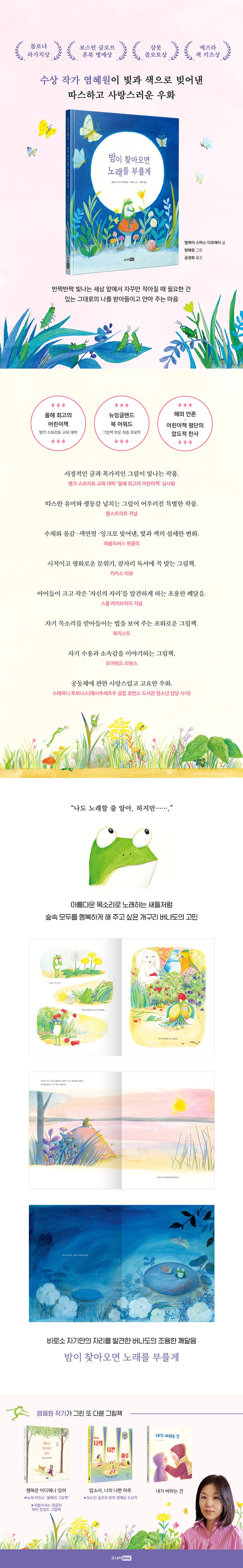세계적인 그림책상을 휩쓸며 고유한 작품 세계를 선보여 온 염혜원 작가의 신작 《밤이 찾아오면 노래를 부를게》는 개구리 ‘버나도’의 이야기를 통해 있는 그대로의 자기 자신을 받아들이는 법을 보여 주는 특별한 작품이다.