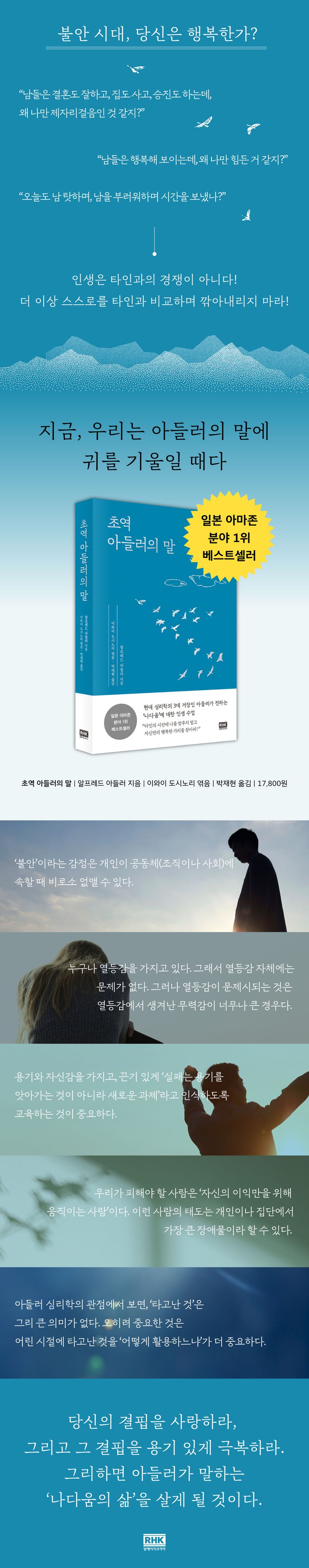 세상에는 다양한 연결 고리가 있다. 부모 자식과의 연결 고리, 부부 또는 연인, 친구, 동료와의 연결 고리, 상사, 부하와의 연결 고리 등 수많은 인간의 연결 고리 속에서 외롭고 막막할 때 아들러가 최고의 조언과 함께 앞으로 나아가는 길을 격려하고 위로해줄 것이다.