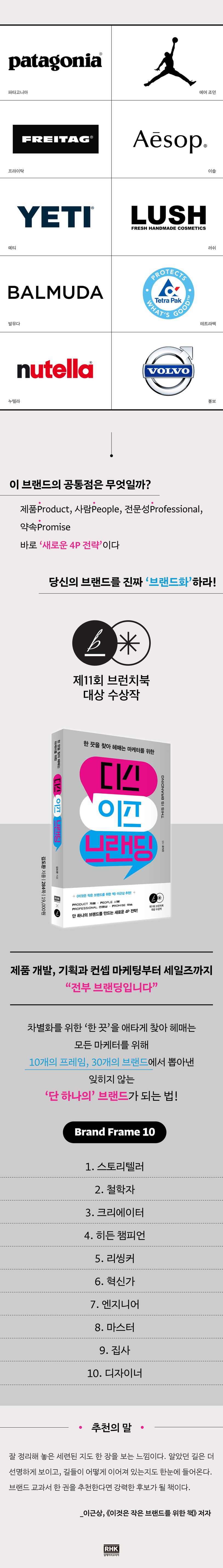 이 책은 제11회 브런치북 출판 프로젝트 대상 수상작으로, 무려 9,000편에 가까운 응모작 중 대상으로 선정되었다. 그 경쟁률이 800:1을 훌쩍 뛰어넘는다. 대상 수상자인 김도환은 브랜드 기획을 10년 이상 진행한 마케터로, 다양한 기업 및 브랜드와 협업하며 얻은 노하우를 바탕으로 효과적이고 성공적인 브랜딩을 하는 방법을 이 책에 담았다. 특히 그는 이 책에서 브랜드를 구축하기 위한 ‘새로운 4P 전략’을 제시한다. 소비 패턴이 달라진 고객을 고려하지 않았던 마케팅의 기존 4P 전략(제품 Product, 가격 Price, 판촉 Promotion, 유통 경로 Place)이 아닌, 새로운 4P 전략(제품 Product, 사람 People, 전문성 Professional, 약속 Promise)이다. 이를 기준으로 브랜드를 10갈래로 나누고, 그에 맞는 30개의 브랜드를 선정해 그들의 방식을 설명한다. 성공을 좌우하는 것은 ‘한 끗’이라고들 한다. 브랜딩을 담당하는 마케터 혹은 자신만의 브랜드를 만들고 싶은 창업자라면 이 책에 주목하자. 당신만의 ‘한 끗’을 발견할 수 있을 것이다.