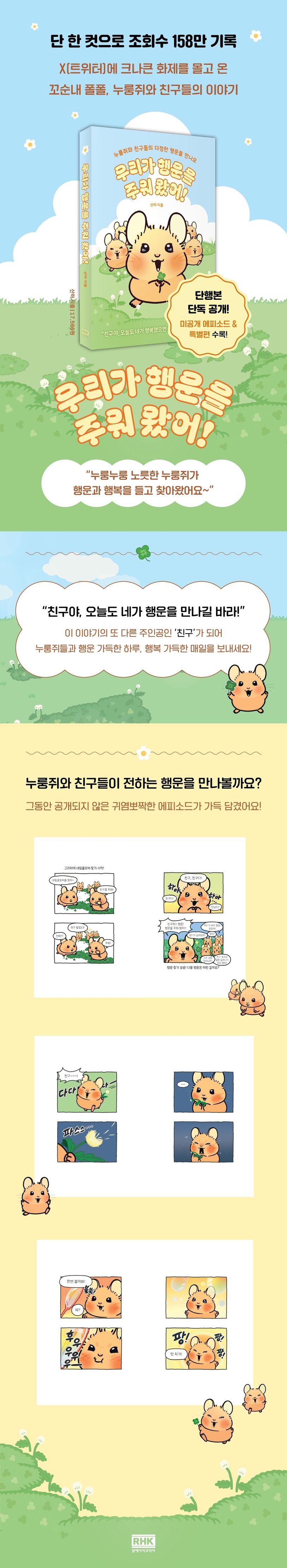 이 책의 또 다른 주인공인 ‘친구’가 되어, 보는 순간 햇살에 닿은 듯 마음이 포근해지는 누룽쥐와 친구들이 전하는 행운과 행복을 만나보자. 하루하루 길고 지루하게 느껴지는 일상 속에서 우리가 미처 못 보고 지나친 행운과 행복을 다시금 재발견할 수 있는 계기가 되어줄 것이다.