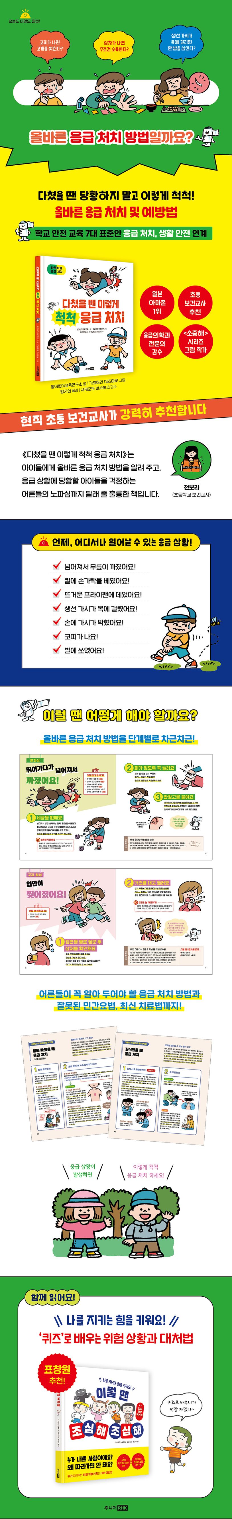 책 마지막에는 아이의 생명이 위태로운 상황에서 어른들이 해야 할 처치 방법(하임리히법, 심폐 소생술 등)과 최신의 상처 치료법을 상세하게 안내하는 코너가 마련되어 있어, 어른들이 위급한 상황에 대비할 수 있도록 했다. 《다쳤을 땐 이렇게 척척 응급 처치》는 온 가족이 함께 볼 수 있는 안전 그림책으로, 아이에게는 내 몸을 스스로 지키는 방법을 익히는 책이, 어른에게는 위급한 상황에서 내 아이를 살릴 수 있는 안내서가 될 것이다.
