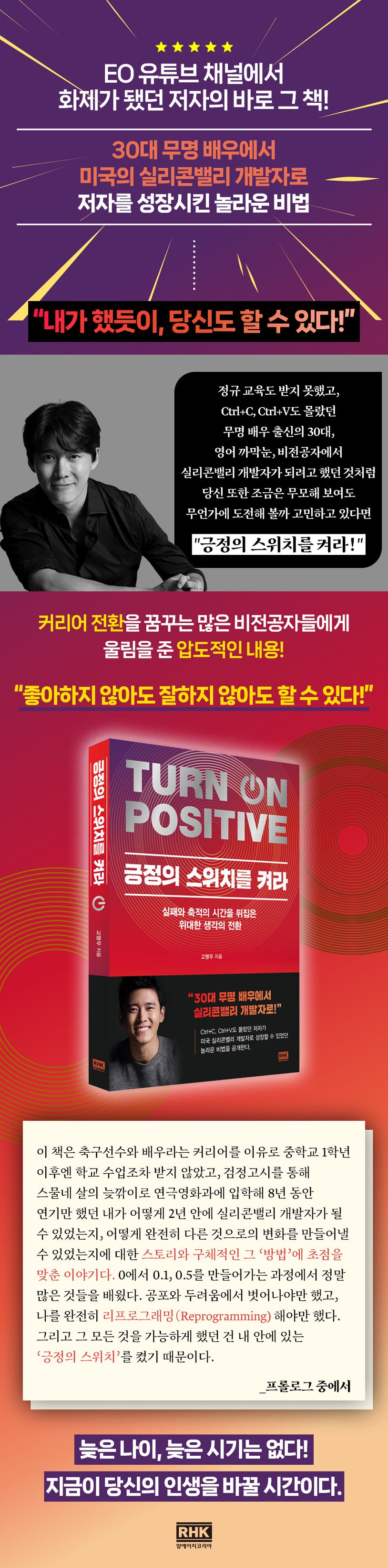 이 책은 좋아하는 일도, 잘하는 일도 아닌 전혀 다른 세상의 직업을 통해 승승장구한 스토리를 담고 있다. 물론 그도 처음에는 좋아하는 일로 시작했다. 어린 시절 축구 선수 유망주로 브라질 프로 유소년팀에 유학 갈 정도로 세계적인 축구 선수가 꿈이었던 저자는 축구를 좋아했고 축구가 인생의 전부였다. 그렇게 시작한 좋아하는 일은 어느 날, 뜻하지 않는 불행으로 물거품이 된다. 피로골절이라는 병명을 얻고 한창 뛰어야 할 고등학교 1학년 때 축구를 그만두게 된다. 인생이 무너질 것 같은 절망감에 방황하던 시절, 연극반 친구의 권유로 연기자의 꿈을 다시 꾸게 된다. 다시 좋아하는 일을 도전하며 208:1의 경쟁률을 뚫고 연극영화과에 입학하고 무명 배우로 8년의 시간을 견뎠지만 남는 건 불안함과 초조함 그리고 경제적 결핍이었다. 죽을힘을 다해 좋아하는 일을 했던 결과는 삶의 결핍만을 안겨줬고 실패의 관성에 사로잡히게 했다. 그렇게 30대가 된 저자는 미지의 세계와도 같은 개발자의 길을 선택한다. Ctrl+C, Ctrl+V도 모르고 독수리 타법에 영어 한마디 못했던 그가 그저 생존하기 위해 잘하지도 좋아하지도 않았던 개발자의 직업을 선택한 것이다. 그리고 IT의 강국 미국 실리콘밸리에서 개발자로 승승장구한 그의 끈질긴 성공의 키워드, 긍정의 스위치가 이 책을 통해 지금 좋아하는 일과 잘하는 일로 고민하는 많은 사람들에게 희망의 메시지를 전하고 있다.