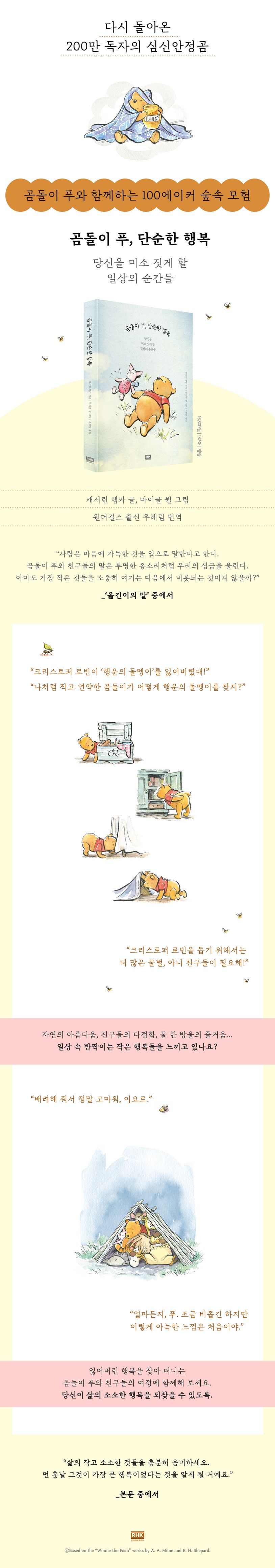 누구나 알고 누구나 좋아하는, 전 세계에서 가장 유명한 아기곰 곰돌이 푸와 친구들이 삶에 관한 명료하고 깊은 성찰을 들고 돌아왔다. 『곰돌이 푸, 단순한 행복』은 곰돌이 푸와 동물 친구들이 100에이커 숲에서 행운의 돌멩이를 찾으러 떠나는 여정을 그린다. 200만 독자들의 심신안정곰! 곰돌이 푸와 친구들의 엉성하고도 사랑스러운 모험 이야기를, 방송인이자 통번역가로 활동 중인 우혜림의 번역으로 만난다.