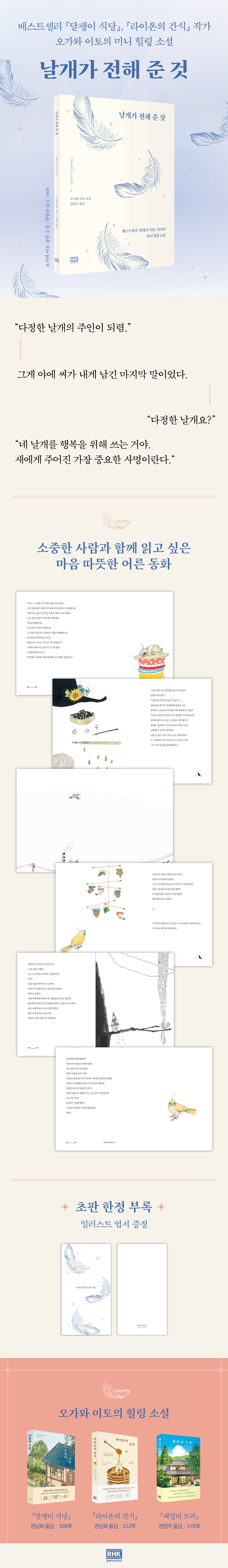 잔잔하면서도 따스한 감성으로 마음의 추위를 녹여 주는 힐링 소설의 대가 ‘오가와 이토’가 일본의 유명 일러스트레이터 ‘구리포포(GURIPOPO)’와 컬래버레이션한 미니 소설 『날개가 전해 준것』이 출간되었다. 작가가 어릴 적 할머니와 함께 새를 키웠던 추억을 바탕으로 10년에 걸친 구상 끝에 완성한 장편소설 『바나나 빛 행복』을 원작으로 탄생한 또 하나의 사랑스러운 이야기다.