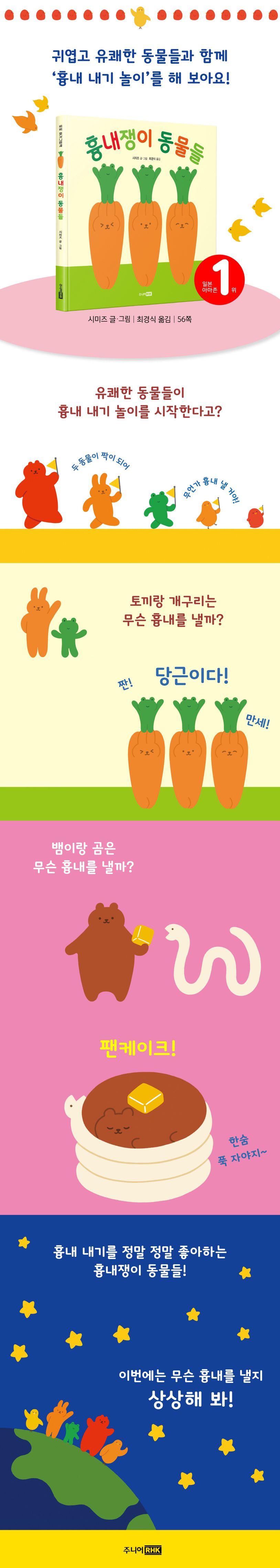 《흉내쟁이 동물들》은 화제의 일러스트레이터 시미즈의 아기그림책으로, 두 동물이 어떤 물체를 흉내 내는지 상상해 보는 놀이그림책이다. “○○와 △△는 무슨 흉내를 낼까?” 하고 질문을 던지면, 다음 장에 동물들이 흉내 낸 물체가 등장하는 두 박자 형태로 구성되어 있다. 동물이 흉내 낸 물체가 무엇일지 생각하고 대답하는 과정을 통해 아이는 관찰력은 물론이고 집중력, 상상력, 창의력에 표현력까지 기를 수 있다. 시각을 자극하는 다채롭고 통통 튀는 색감, 귀엽고 사랑스러운 동물 캐릭터는 아이와 어른 독자 모두의 눈길을 사로잡는다.