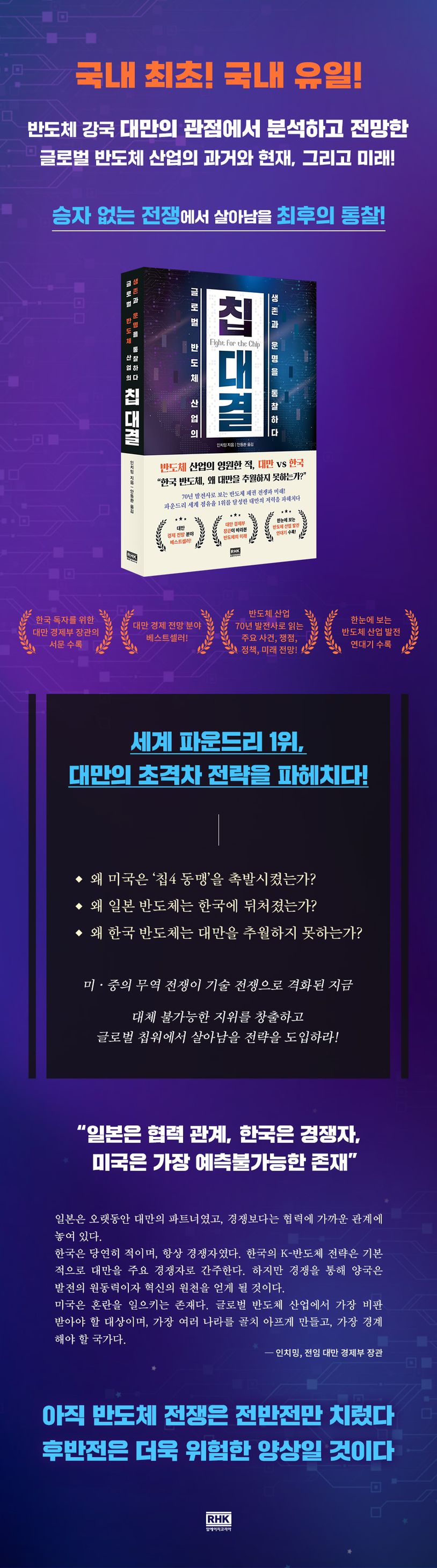 이 책의 저자이자 ‘40여 년간 대만 반도체 산업을 이끈 공헌자’라고도 불리는 전임 대만 경제부 장관 인치밍은 70년에 달하는 방대한 반도체 산업의 발전사를 한 편의 거대한 시나리오로 재구성해서, 반도체 산업의 역사에서 중대한 전환점이 되었던 주요 사건과 쟁점, 국가별 정책을 심오한 관점에서 분석하고 쉽게 이해할 수 있도록 설명한다. 또한 기존에 선두주자로 활약하던 미국과 일본, 유럽연합과 뒤늦게 반도체 제조에 뛰어든 한국과 대만, 싱가포르, 말레이시아, 인도라는 신흥 반도체 생산국, 반도체 붐을 일으키며 미국과 무역 전쟁을 빚어 세계적으로 충격을 일으킨 중국의 산업 발전 역사도 흥미롭게 풀어낸다.