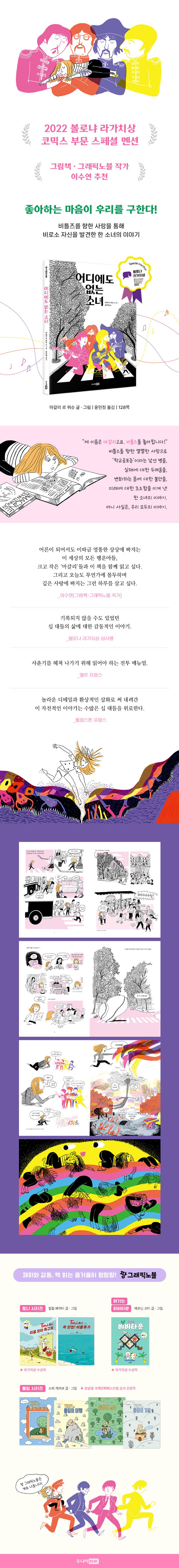 《어디에도 없는 소녀》 속 주인공 ‘마갈리’는 중학교에 입학하자마자 우등생이 되어야 한다는 욕심에 조급해지고 어수선하고 강압적인 학교 분위기에 점점 주눅이 든다. 결국엔 ‘학교공포증’을 진단받아 홈스쿨링을 하게 되는 마갈리. 그러던 어느 날, 상처받은 마음과 자신을 점점 잃어 가는 것만 같은 기분에 힘들어하던 마갈리 앞에 ‘비틀즈’라는 존재가 등장하고, 마갈리는 비틀즈에 완전히 매료된다. ‘비틀즈 덕후’가 된 마갈리는 그들을 향한 사랑을 통해 자신의 아픔을 치유하고 위로받으며, 마침내 자기 자신이 어떤 사람인지를 발견한다. 이러한 마갈리의 모습은 팬덤 문화에 익숙한 우리 청소년들에게 큰 공감으로 다가갈 것이다. 또한 이야기 안에서 비틀즈가 아주 중요하게 등장하는 만큼 비틀즈를 사랑하는 국내 팬들도 반겨할 작품이다.