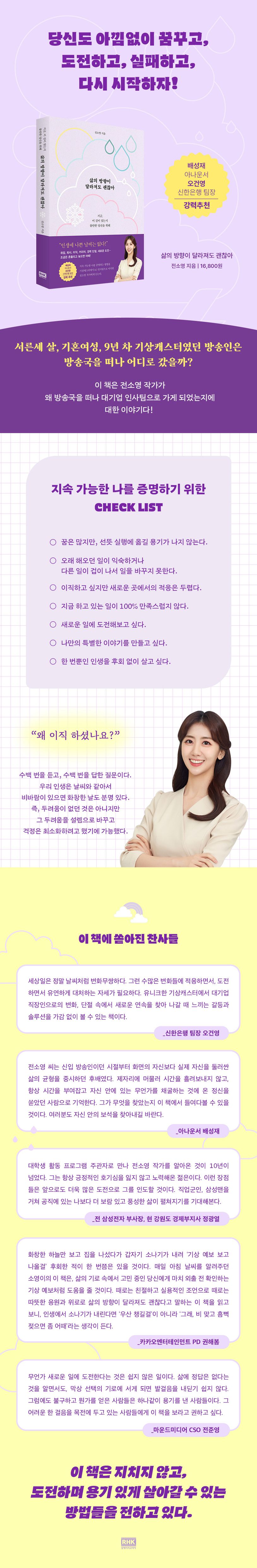 이 책은 매일 주어진 업무를 반복하며 고민하다가, 문득 방송 9년 차에 전혀 다른 곳으로의 이직에 성공한 ‘날씨를 누구보다도 닮은’ 전직 기상캐스터 전소영 작가의 이야기다. 누구보다 치열하게 삶에 도전하고, 좋아하는 일을 찾기 위해 고민한 전소영 작가의 여정을 따라가다 보면 인생의 방향을 트는데 용기가 샘솟을 것이다. 진로를 고민하는 취업준비생과 이직, 전직하기에는 이미 늦었다고 생각하는 직장인을 위한 조언을 책 한 권에 담았다.