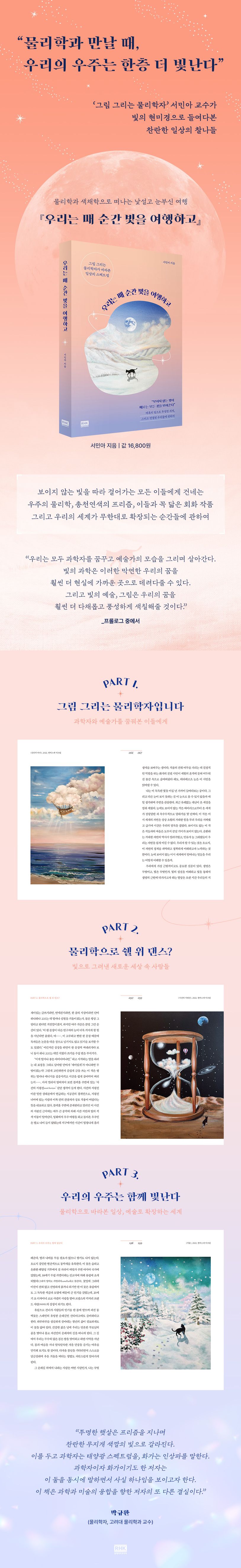 저자는 현대 미술(인상주의)이 시작되는 시기와 현대 물리학이 시작된 시기가 정확히 일치한다는 점에서 과학과 예술은 ‘빛’이라는 공통점으로 연결된다고 말한다. 즉, 물리학계과 미술계의 흐름을 바꾼 건 모두 빛이었다는 뜻이다. 과학과 예술이라는 길의 한가운데 선 물리학자는 그간 저서 『미술관에 간 물리학자』, 『빛이 매혹이 될 때』를 통해 아득히 멀기만 해 보이는 두 세계를 연결함으로써 그만이 할 수 있는 이야기를 들려줬다. 신작 『우리는 매 순간 빛을 여행하고』는 어린 시절 한 번쯤 과학자를 장래 희망으로 꿈꾸고 자유로운 예술가의 모습을 그려봤을 독자들에게, 한평생 빛의 색채학과 그림이라는 예술을 진심으로 사랑한 이의 투명한 마음을 전한다.