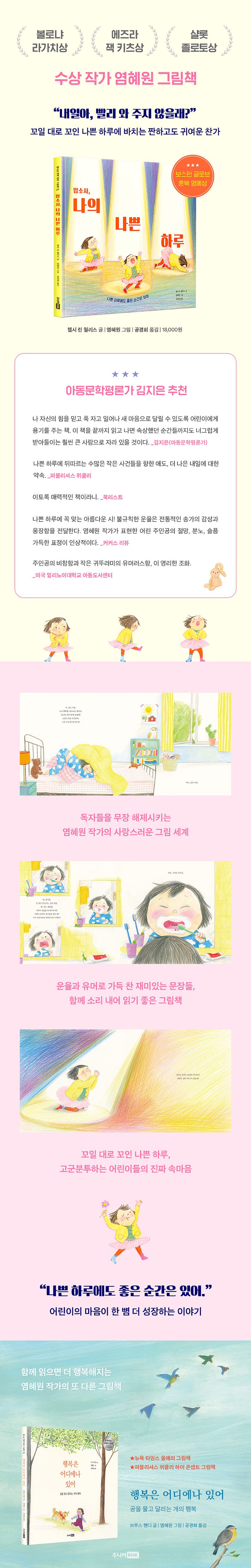 눈을 뜬 순간부터 잠들기 전까지 뜻대로 되는 일이 하나 없는 주인공의 엉망진창 나쁜 하루가 염혜원 작가만의 따듯함과 위트 가득한, 사랑스러운 그림으로 탄생했다. 비극의 주인공처럼 바닥에 주저앉아 “내일아, 빨리 와 주지 않을래?”라고 애원하며 눈물 콧물 쏟아 내는 어린 주인공의 짠하면서도 귀여운 모습을 보고 있으면 입가에 저절로 웃음이 번진다. 초등 교사 출신 어린이책 작가이자 시인인 저자가 선보이는 운율이 살아 있는 단어와 문장들, 어린이의 마음과 감정을 고스란히 담아낸 입말은 번역가 공경희의 섬세한 번역을 거쳐 우리말에서만 느낄 수 있는 말맛을 덧입었다. 눈을 즐겁게 하는 장치들도 놓치지 말아야 할 이 작품의 포인트다. 산뜻한 핑크 별색 잉크를 사용해 화사하고 풍부한 색감을 감상할 수 있으며, 표지 재킷을 벗기면 안쪽 표지에서 주인공 소녀를 바라보는 사랑스럽고 깜찍한 캐릭터들도 만날 수 있다.