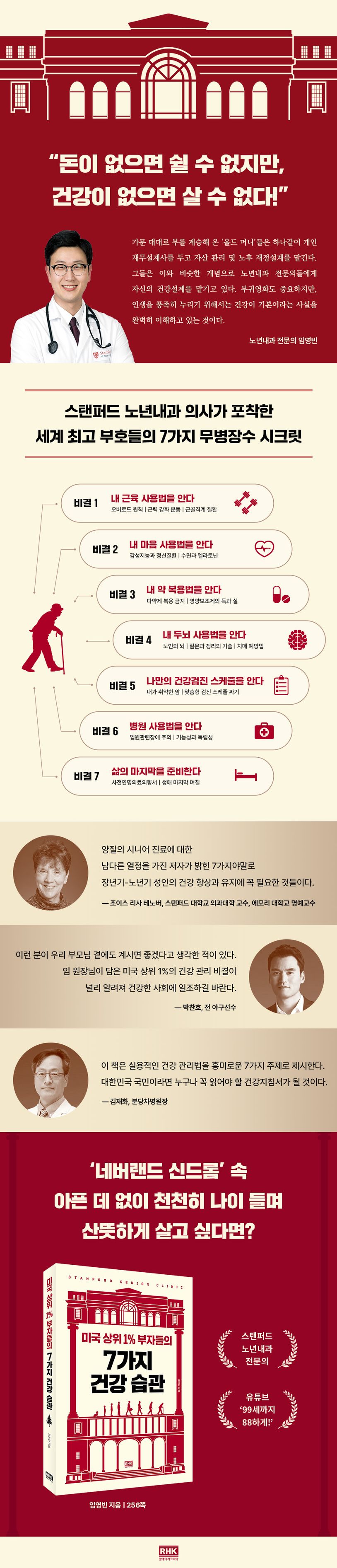 저자는 유튜브 ‘99세까지 88하게_임영빈 내과’를 통해 스탠퍼드 노년내과에서 배운 양질의 의료 지식을 전하는 한편, 그가 미국 상위 1% 부자 시니어들에게서 포착한 근육과 마음, 뇌, 약, 건강검진, 병원 사용법과 생의 마지막을 준비하는 방법에 이르는 7가지 무병장수의 비결을 널리 알리고자 이 책을 썼다.