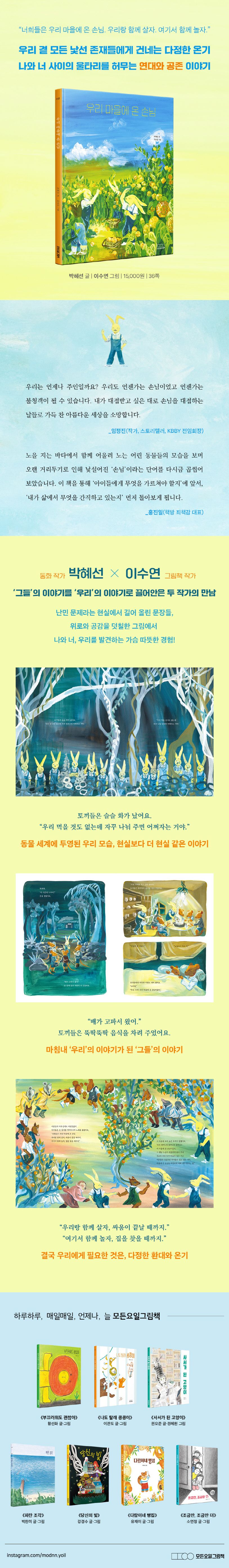 ‘모든요일그림책’에서 여덟 번째 그림책 《우리 마을에 온 손님》을 선보인다. 한국아동문학상, 소천아동문학상 등 유수의 문학상을 수상한 동화 작가 박혜선, 그래픽노블과 그림책을 넘나들며 독자의 마음을 위로하는 작가 이수연이 ‘연대와 공존’을 그려 낸 작품이다. 《우리 마을에 온 손님》은 배가 고파서, 긴 장마에 마을이 사라져서, 이웃 마을에서 싸움을 걸어와서 살 곳을 잃은 동물들로 북적북적해진 토끼 마을을 배경으로 한다. 저마다의 이유로 삶의 터전을 등지고 떠날 수밖에 없는 난민과 난민을 대하는 우리의 태도, 타인과 나 사이에 두꺼운 편견의 벽을 쌓는 우리의 이기심이 동물들의 세계에 여과 없이 투영되어 있다.