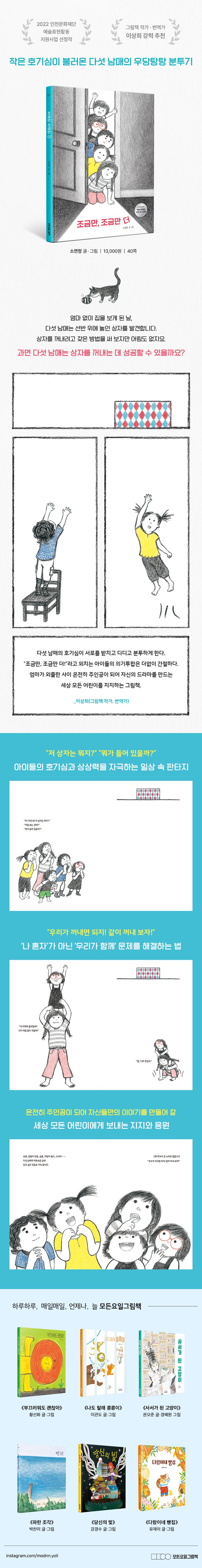 모든요일그림책 일곱 번째 그림책 《조금만, 조금만 더》가 출간되었다. 엄마 없이 집을 보게 된 날, 선반 위에 놓인 상자를 발견한 다섯 남매의 우당탕탕 분투기가 장면 가득 펼쳐진다.