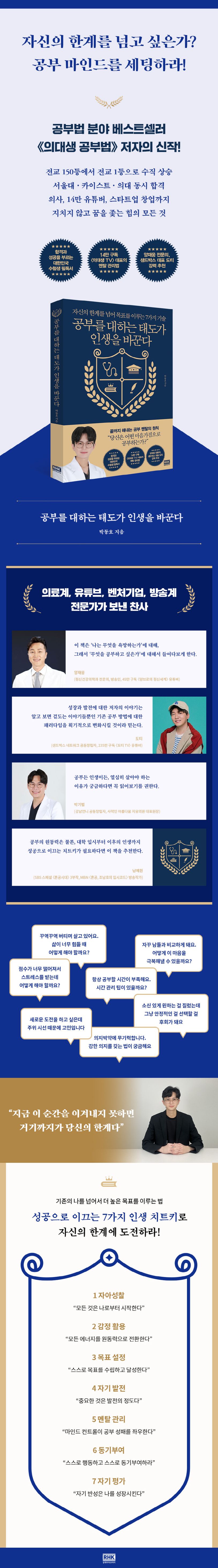 중학교 때 전교 150등에서 고등학교 때 전교 1등까지 성적을 끌어올리며 여의도고를 수석 졸업하고 서울대·카이스트·의대에 동시 합격한 현직 의사이자, 14만 유튜브 채널 〈의대생 TV〉 대표인 저자의 공부 인생을 있는 그대로 담은 책이 출간된다. 태어날 때부터 1등 유전자는 아니었던 저자가 자신의 한계를 넘어 목표를 이룰 수 있었던 비법은 바로 공부를 대하는 태도에 있었다.
