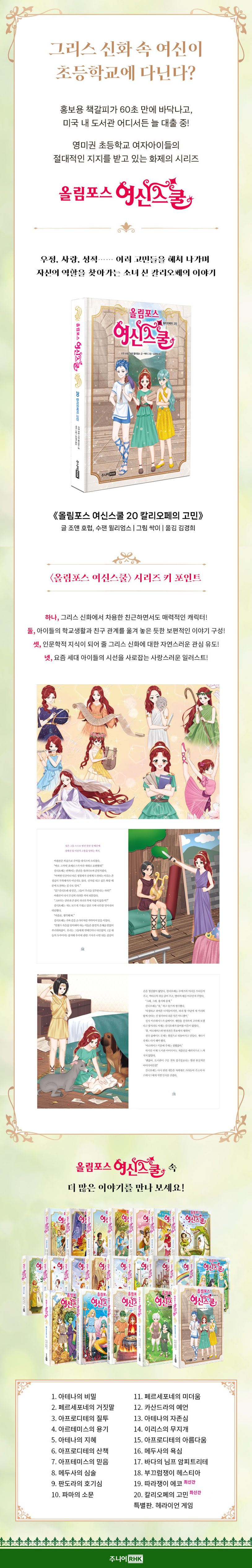 이 화제의 시리즈 〈올림포스 여신스쿨〉 한국어판은 2012년에 첫 번째 이야기 《아테나의 비밀》을 시작으로 꾸준히 출간되어 왔다. 그리스 신화 속에 등장하는 여신들을 중심으로 한 〈올림포스 여신 스쿨〉은 다채로운 캐릭터와 생동감 넘치는 이야기들로 가득하다.