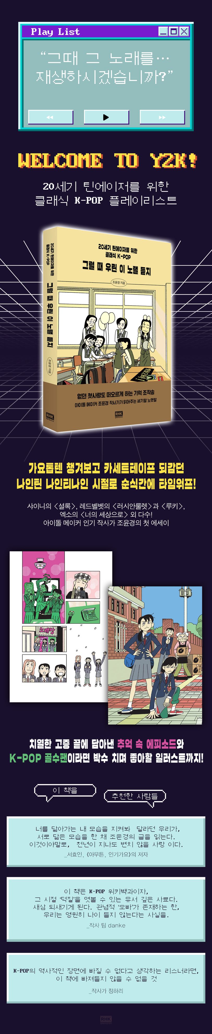 책 《그럴 때 우린 이 노랠 듣지》는 90년대부터 2000년대 초반까지 ‘틴에이저 감성’을 책임졌던 클래식 K-POP의 정수를 펼쳐놓으며, 그 자체로 메시지였던 가사들을 인용해 추억 속 장면들을 되살린다. 이어폰부터 대형 스피커까지 음악이 나오는 곳이라면 어디라도 찾아갔던 리스너listener들에게 반가움을 선사하는 한편, 무작정 따라 불렀던 가사의 비하인드들을 풀어놓으며 세기말 노랫말에 대한 통찰도 곁들인다. 알 수 없는 알고리즘이 귀신같이 알고 추천한 90년대 히트송에 가슴이 웅장해지고 심장이 요동친 적, 있는가? 당신에게 이 책이, 한 번 재생하면 일시 정지 누를 수 없는 중독성 짙은 플레이리스트가 될 것이다.