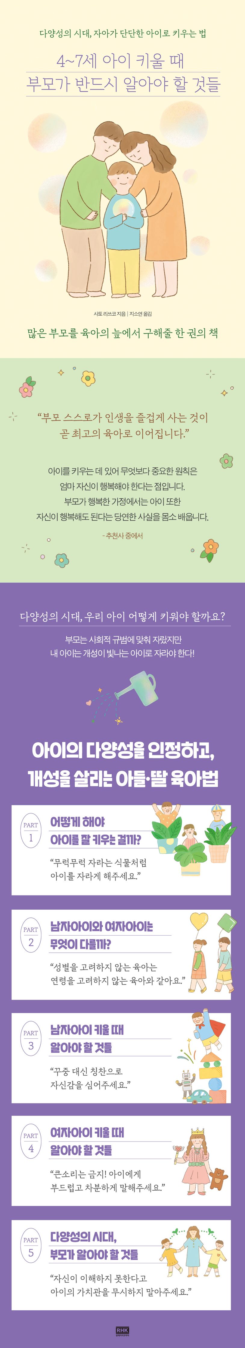 『4~7세 아이 키울 때 부모가 반드시 알아야 할 것들』은 각자의 개성을 존중하는 시대에 자녀를 대하는 방법을 고민하는 부모에게 아이를 키울 때 반드시 알아야 할 것을 알려줍니다. 남자아이를 키울 때, 여자아이를 키울 때 알아야 할 요즘 시대에 딱 맞는 육아법이 담겨 있습니다.