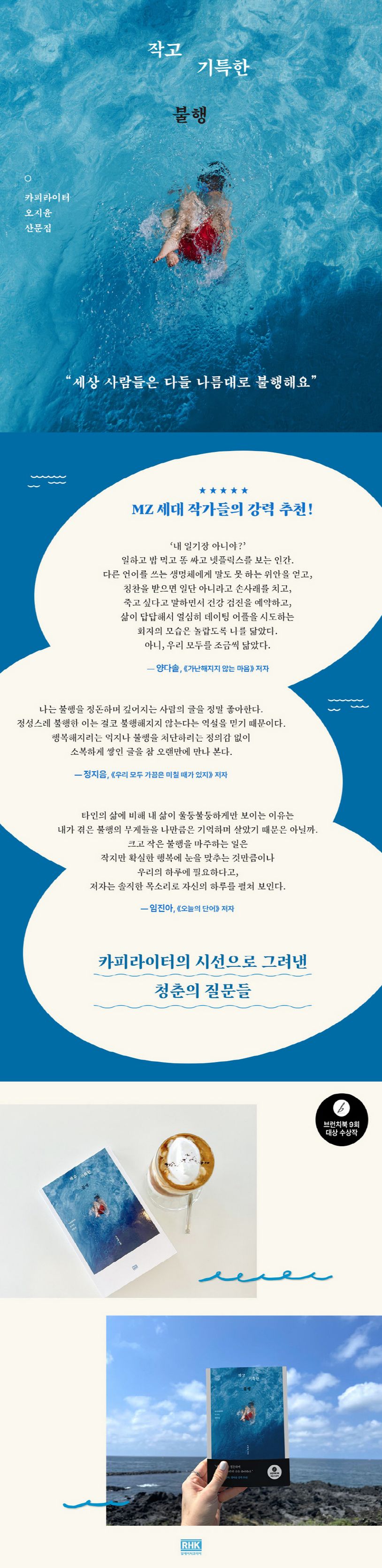 제9회 브런치북 대상 수상작인 오지윤 작가의 《작고 기특한 불행》이 출간되었다. 이 책은 너도나도 이야 기하는 소확행 대신 우리를 성장하게 하는 ‘소소하고 확실한 불행’을 따스하게 품어낸 기록이다. 세상 사람들은 다 행복해 보이는데 나만 불행한 것 같아 외로운 날, 근거 없는 “힘내” 대신 “너만 그런 거 아니야”라며 다독여 주는 친구처럼 곁에 두고 끝없이 읽고 싶은 글들이 빼곡히 담겼다. 크고 작은 불행을 마주하는 일은 작지만 확실한 행복에 눈을 맞추는 것만큼이나 우리의 하루에 필요하다고, 작가 오지윤은 솔직한 목소리로 자신의 하루하루를 여과 없이 펼쳐 보인다.