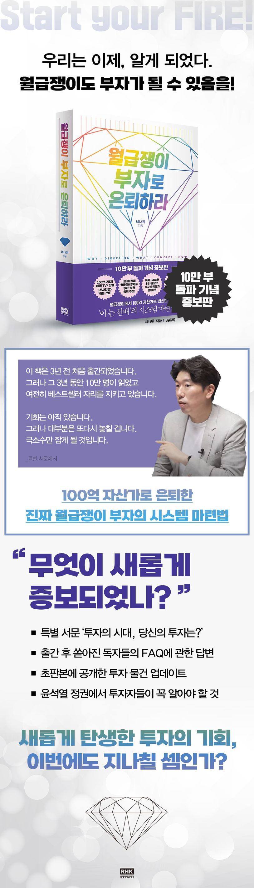 《월급쟁이부자로은퇴하라》는김과장이회사밖으로눈을돌려,스스로돈걱정없는미래를위해필요한계획을세우고이를실행한과정과마침내이뤄낸성과를낱낱이기록한책이다.‘급여’라는비교적안정적인현금흐름을가진월급쟁이가돈을쓰는방식을변화시켜어떻게투자하면되는지알려주는‘직장인의포지션전략’을제공하는한편,투자할돈이없다는이들을위해‘자본재배치’라는방식으로종잣돈을마련하는법도알려준다.또한그는지금도참고하고있는기준과순서를담은‘투자매뉴얼’을공개해,투자의‘ㅌ’자도모르는초보라도지금당장따라할수있게돕는다.무엇보다자신이어떤지역어떤아파트에얼마의돈을투자해어느정도의수익을거두었는지도숨김없이공개함으로써,독자들이간접적인경험을통해자연스럽게투자를배울수있게한다는것도장점이다.특히새롭게출시되는‘10만부돌파기념증보판’에는이책을처음접하는독자는물론,기존독자들도반길만한내용이추가로담겼다.초판이출간되었던2019년과는비교도안될만큼치솟아버린부동산가격과일반투자자에게는가혹하다싶을만큼심해진규제와세금및정책변화속에서,많은이가너나위의방법이여전히유효한가에의심을품었던것도사실이다.이에너나위는그간받았던독자FAQ에대한답변을내놓는한편,초판에공개한자신의투자사례의시세변화를업데이트하면서이를통해증명된것과새롭게얻은인사이트를소개한다.또한윤석열대통령이내놓은부동산공약중‘투자자’라면반드시알고있어야할내용도짚는다.너나위의따뜻한친필메시지와사인은10만독자들을위한선물로면지에인쇄해담았다.