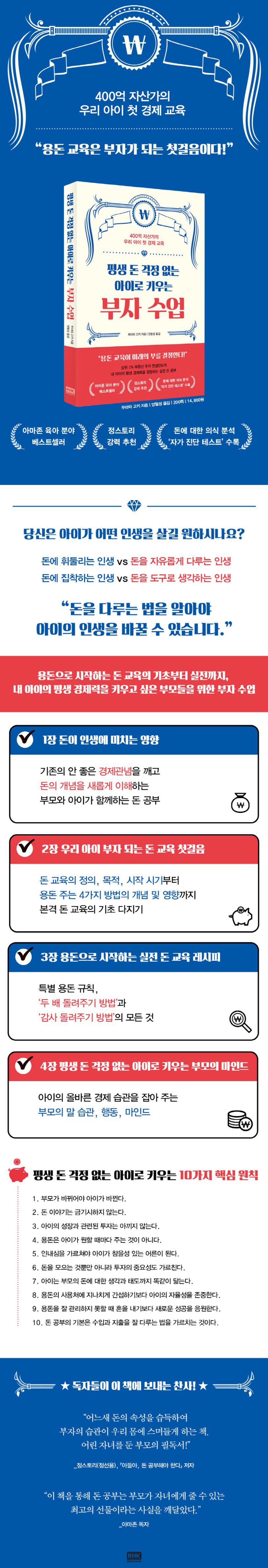 『평생 돈 걱정 없는 아이로 키우는 부자 수업』은 아이의 경제 교육을 시작하는 시기, 무엇을 어떻게 가르치면 좋을지 고민하는 부모에게 적절한 최강의 돈 공부 필독서이다. 저자가 모임을 운영하며 조사한 내용을 바탕으로 다양한 사례와 함께 설득력 있는 돈 교육법을 전하며, 돈이 인생에 미치는 영향부터 돈 교육의 기초와 실전까지, 나아가 부모가 지녀야 할 마인드에 대한 내용을 제공한다. 아이가 장차 돈에 휘둘리지 않는 어른으로 성장하길 바라는 부모라면, 내 아이의 올바른 경제관념과 똑똑한 경제 습관을 기르는 데 큰 도움을 받을 수 있을 것이다.