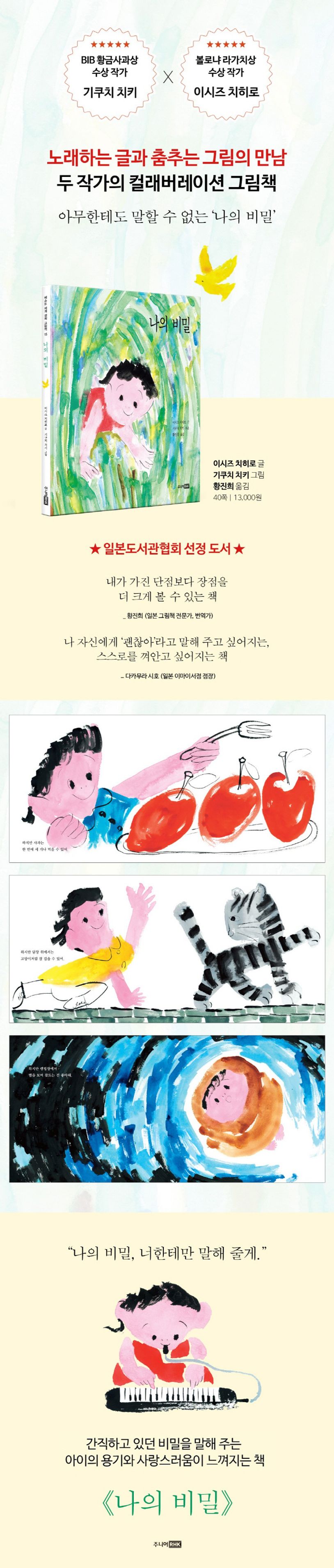 《나의 비밀》은 일본도서관협회 선정 도서로, BIB 황금사과상을 수상한 기쿠치 치키와 볼로냐 라가치상을 수상한 이시즈 치히로의 컬래버레이션 그림책이다. 반복되는 운율과 리듬감이 돋보이는 짤막한 글에 강렬한 색감과 붓터치가 환상적인 그림이 어우러진 이 작품은 누가 보아도 한 사람이 쓰고 그렸다고 느껴질 정도로 글과 그림이 완벽한 조화를 이룬다.
