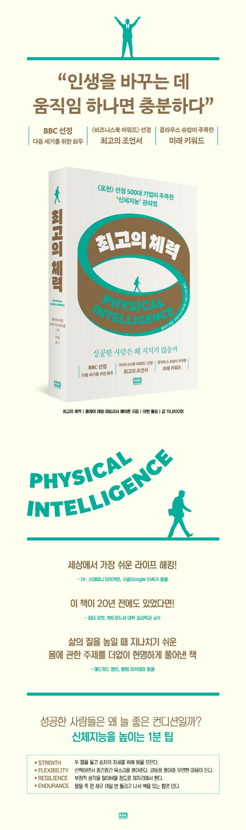이 책은 소니, 코카콜라, 로레알, 캔두코 등 〈포천〉 선정 500대 주요 기업 임직원을 30여 년간 컨설팅하면서 완성한 두 저자만의 신체지능 관리법을 바탕으로 한다. 움직임을 교정해 정신 상태까지 자동으로 좋아지도록 하는 일종의 ‘관리 시스템’으로, 이를 신체지능으로 압축해 국내에 최초로 소개한다. 그들에 따르면 약간의 자극만으로도 위기를 겪는 몸과 마음을 매일 최상의 컨디션으로 거듭날 수 있다.