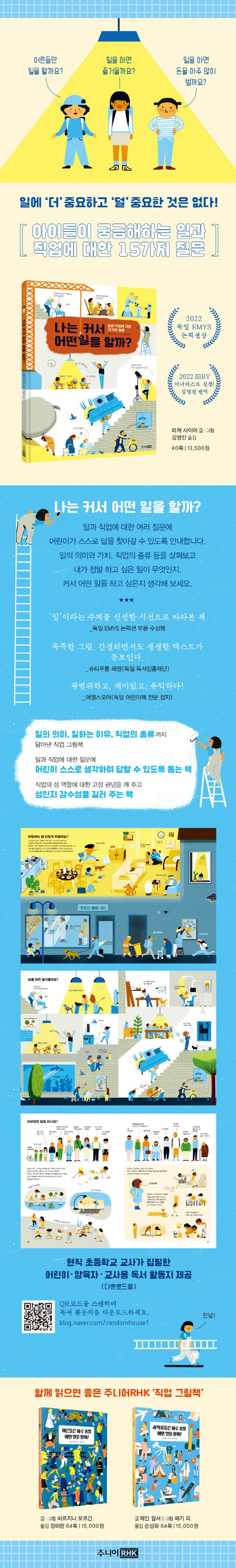 《나는 커서 어떤 일을 할까?》는 일과 직업에 대해 아이들이 궁금해하는 질문을 던지며 일의 의미부터 일하는 이유, 직업의 종류까지 담아낸 직업 그림책이다. 유아부터 초등학생의 진로 교육은 단순히 직업의 종류를 알려 주고 체험할 수 있게 하는 것에서 그쳐서는 안 된다. 일과 직업의 의미를 알고, 직업을 선택할 때 어떤 가치를 앞에 두어야 하는지를 깨닫게 하는 것이 더 중요하다.