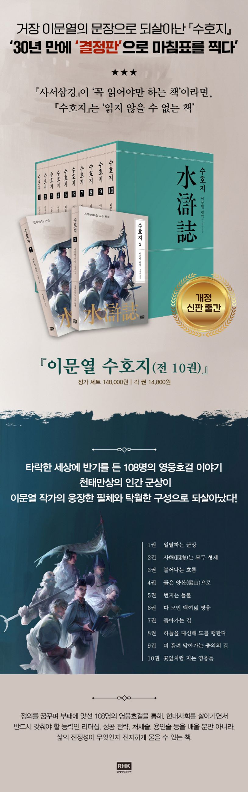 이 책은 그저 험한 도적 떼들의 영웅담으로 끝나는 것이 아니다. 하늘을 대신해 정의를 행하기로 맹세한 영웅호걸들이 때론 북송을 압박하던 요와 싸우기도 하고 부패한 관료들과 맞붙기도 하면서, 민심을 대변하듯 끊임없이 정의에 대해 화두를 던진다. 그 모습이 혼탁한 지금의 우리와 일맥상통한 면을 볼 수 있다. 어쩌면 오랜 시간 여전히 『이문열 수호지』가 읽혀 왔고 또 읽어야만 하는 이유가 아닐까 싶다.