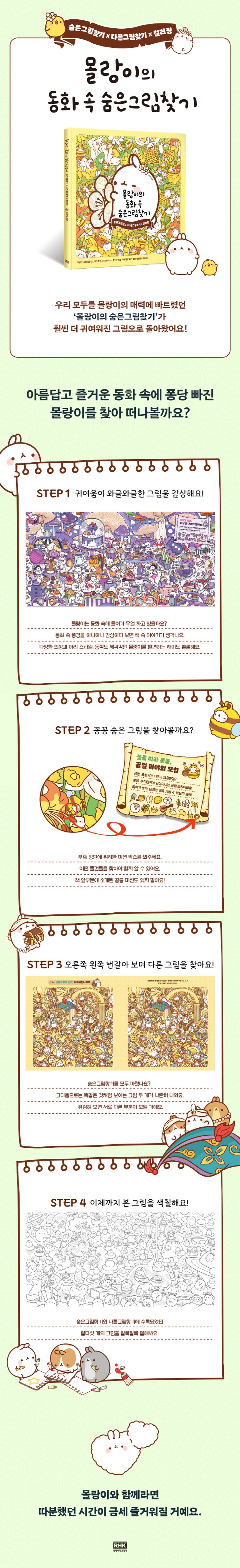 큰 인기를 얻었던 전작 《몰랑이의 숨은그림찾기》에 이어, 아기자기하고 귀여운 그림으로 가득 채운 《몰랑이의 동화 속 숨은그림찾기》가 찾아왔다. 이 책은 동화책을 읽다가 동화 세상으로 퐁당 빠진 몰랑이를 찾아 떠나는 여정을 그리며, 숨은그림찾기와 다른그림찾기, 컬러링까지, 세 가지 활동을 즐길 수 있도록 구성했다. 이상한 나라의 앨리스, 어린 왕자, 미녀와 야수 등 누구나 아는 열다섯 편의 동화 속 세상을 누비는 몰랑이를 보는 즐거움이 가득하다. 아기자기함과 귀여움이 와글와글 쏟아지는 그림에 탄성이 나오고 소품, 의상의 디테일을 포착하는 즐거움은 덤으로 누릴 수 있다. 특별히, 전작에는 없었던 다른그림찾기를 더해 더욱 다채로운 재미를 누릴 수 있다. 그림으로 한 번, 재미있는 미션으로 또 한 번, 힐링하는 시간이 될 것이다.