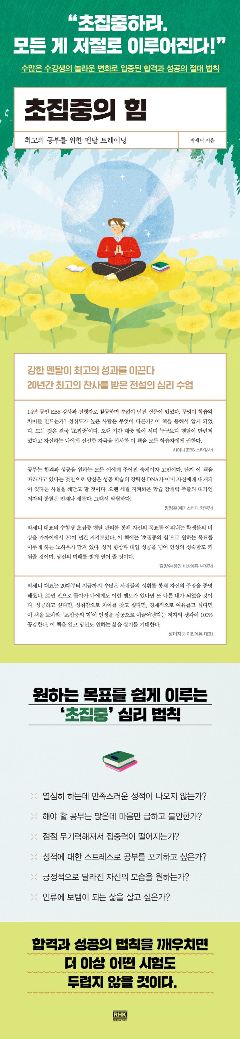 "초집중하라.모든게저절로이루어진다!”수많은수강생의놀라운변화로입증된합격과성공의절대법칙입시멘탈프로그램의핵심기본서같은공간에서같은책으로같은강의를들어도누구는합격의영광을누리고누구는불합격의고배를마신다.그차이를결정짓는것은무엇일까?바로집중력이다.공부시간확보와제대로된학습법을갖추고있다면멘탈을강하게키워초집중력을최대치로발휘해야한다.시험에떨어질까두렵고,자신감이부족한가?공부스트레스로잠을못이루는가?공부는혼자만의힘으로이겨내야하기에힘들고어렵다.입시또는시험에실패한경험이있다면더욱그럴것이다.저자는공부에대한불안으로불면증에시달린다면‘성적이떨어지지않는것’이아니라‘성적이오르는것’에온전히집중해야한다고말한다.이초집중상태를만드는습관은하루아침에생기지않는다.매시간다짐하며집중력이흐트러지면다시원하는것에몰입하는과정을수없이거쳐야한다.20년간최고의찬사를받은전설의심리수업“멘탈이바뀌면인생이바뀐다!”자기계발및멘탈강화를위한지침서《초집중의힘》은20년간대입학원계에서최고의성과를이끈심리전문가박세니저자가초집중력을최대치로끌어내는비법을전수하는책이다.인간의심리적특성을파악하여초집중의힘을일상에서활용하는데목적이있으며,공부뿐만아니라사회성및인간관계기술,업무분야에서의월등한성취,목표달성을위한강력한동기부여,성공을위한실전적인행동법칙등의내용을담았다.초집중심리법칙37가지를무의식에제대로새기면성적향상뿐만아니라자신의목표와꿈을이룰수있게될것이다.다음에해당하는사람들이라면이책을읽기를권한다.?열심히하는데만족스러운성적이나오지않는가??해야할공부는많은데마음만급하고불안한가??점점무기력해져서집중력이떨어지는가??성적에대한스트레스로공부를포기하고싶은가??긍정적으로달라진자신의모습을원하는가??인류에보탬이되는삶을살고싶은가?저자는인생은‘초집중’이며우리또한‘초집중’하기위해태어났다고확신한다.우리두뇌를이해하고활용해초집중을일상에서연결하면원하는바를이룰수있게될것이다.인생에대한깊은이해와통찰이담긴이책이삶을개척해나가려는사람들에게깨달음이되기를바란다.