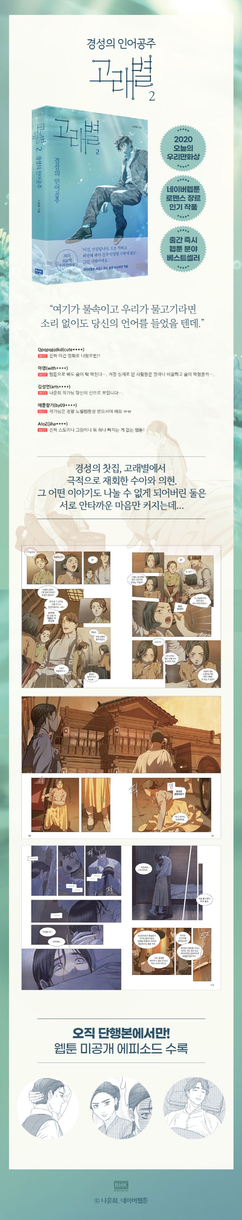 안데르센의 〈인어공주〉를 모티브로 한, 일제 강점기 경성의 동화 같은 로맨스 웹툰 〈고래별〉의 단행본 2권. 독립 운동가 의현은 전북 군산에서 지령을 수행하던 중 기약 없이 헤어졌던 해수와 경성의 찻집 고래별에서 극적으로 재회한다. 군산에서의 일들은 묻어둔 채 다음 기회를 엿보던 둘 앞에 불현듯 수아가 찾아온다. 그런데 어찌 된 일인지 그녀는 말 한마디도 꺼낼 수 없는 상태가 되었다. 의현은 원망 어린 눈물만 쏟아내는 수아의 곁을 묵묵히 지키는데…