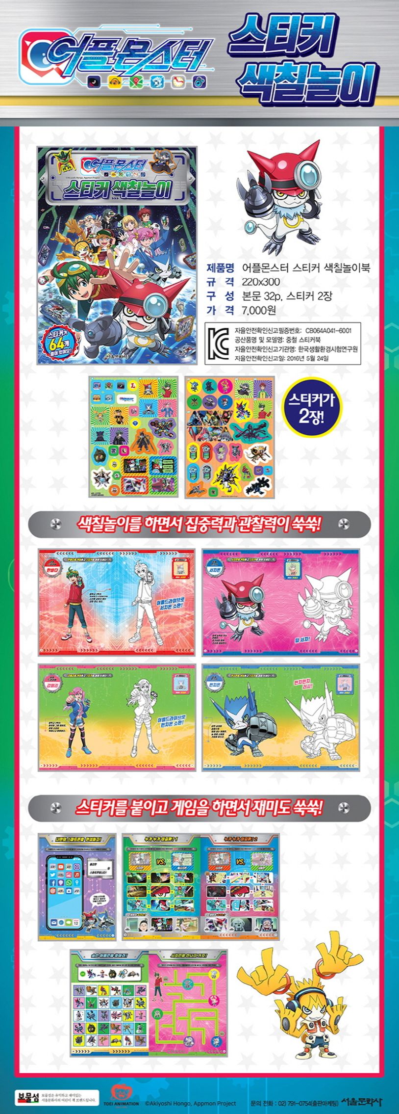 어플몬스터 캐릭터를 색칠하고 스티커를 붙이며 게임도 하는 <어플몬스터 스티커 색칠놀이북>이 출간되었어요. 어플드라이버와 어플몬을 색칠하고 ‘참 잘했어요’ 파트너 스티커를 붙여 보세요. 다양한 게임도 가득하답니다. 게임을 통해 애니메이션에서 서치몬과 다른 어플몬스터와 대결하면 누가 이길지 알아봐요. <어플몬스터 스티커 색칠놀이북>에 흠뻑 빠져 즐거운 모험을 떠나요!