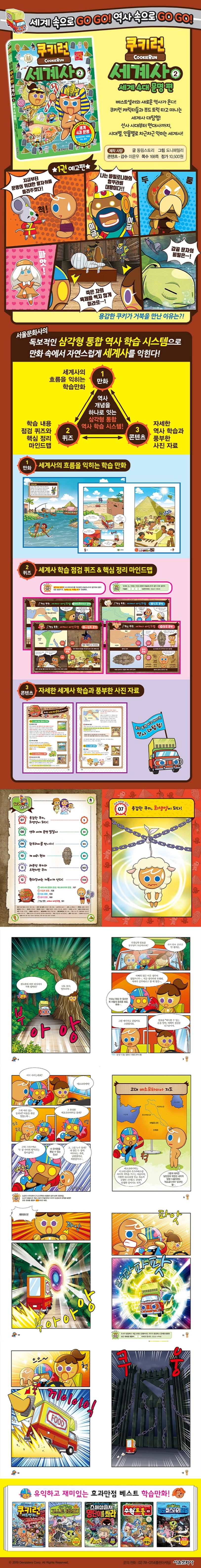 서울문화사의 독보적인 ‘삼각형 통합 역사 학습 시스템’으로 만화 속에서 자연스럽게 세계사를 익힐 수 있습니다. 시간 여행을 떠난 쿠키런 캐릭터와 함께 저절로 세계사의 흐름을 익히는 학습 만화, 매 에피소드마다 간단하게 복습하는 학습 점검 상식과 퀴즈, 그리고 핵심 요약을 네 컷 만화로 정리한 핵심 정리 마인드맵, 자세한 세계사 학습 내용과 풍부한 사진 자료가 가득한 콘텐츠까지, 쿠키런 캐릭터가 떠나는 시간 여행에 흠뻑 빠져 있다 보면 선사 시대부터 현대까지 세계사의 흐름이 머릿속에 콕콕! 정리됩니다.