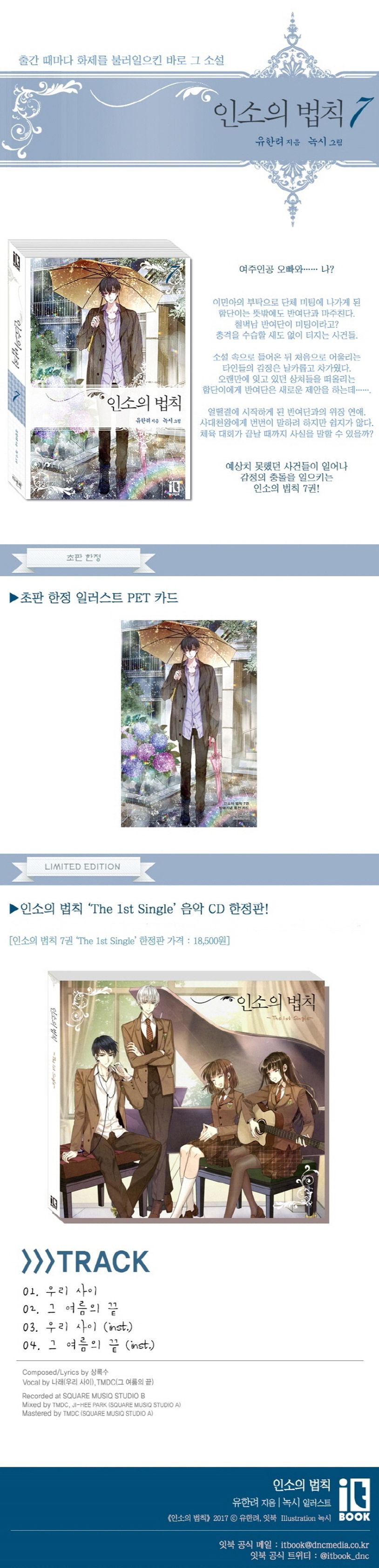 유한려의 『인소의 법칙』 제7권. 이민아의 부탁으로 단체 미팅에 나가게 된 함단이는 뜻밖에도 반여단과 마주친다. 철벽남 반여단이 미팅이라고? 충격을 수습할 새도 없이 터지는 사건들. 소설 속으로 들어온 뒤 처음으로 어울리는 타인들의 감정은 날카롭고 차가웠다. 오랜만에 잊고 있던 상처들을 떠올리는 함단이에게 반여단은 새로운 제안을 하는데…